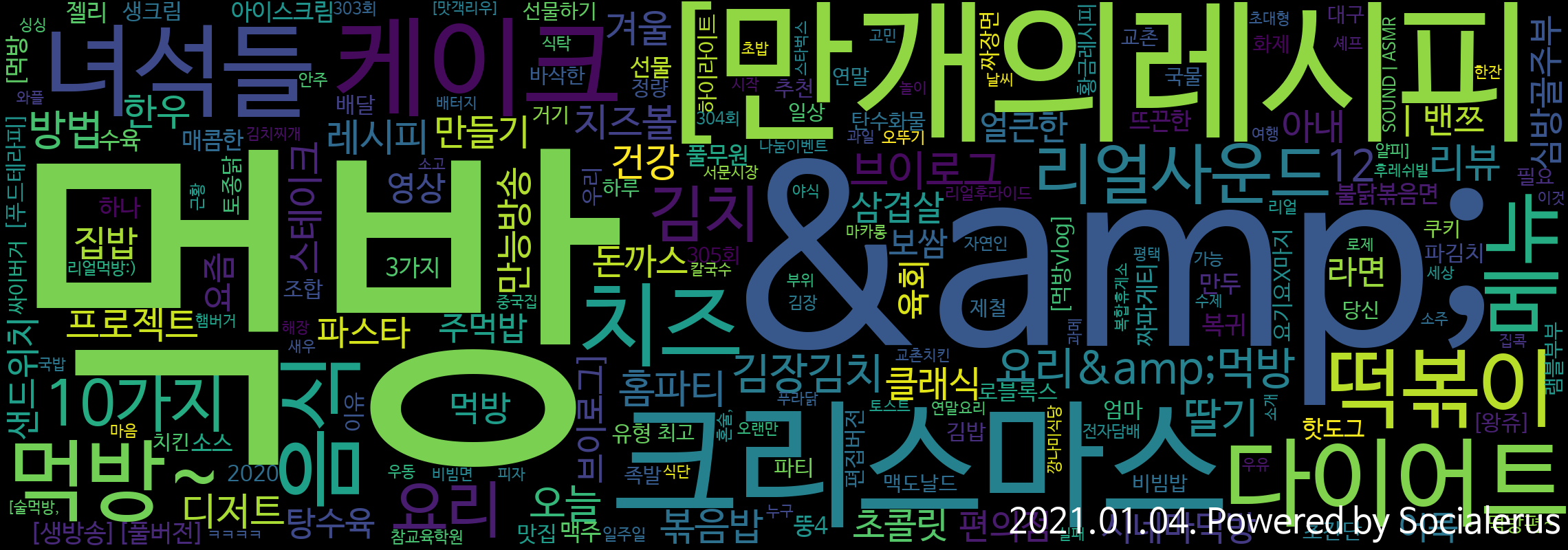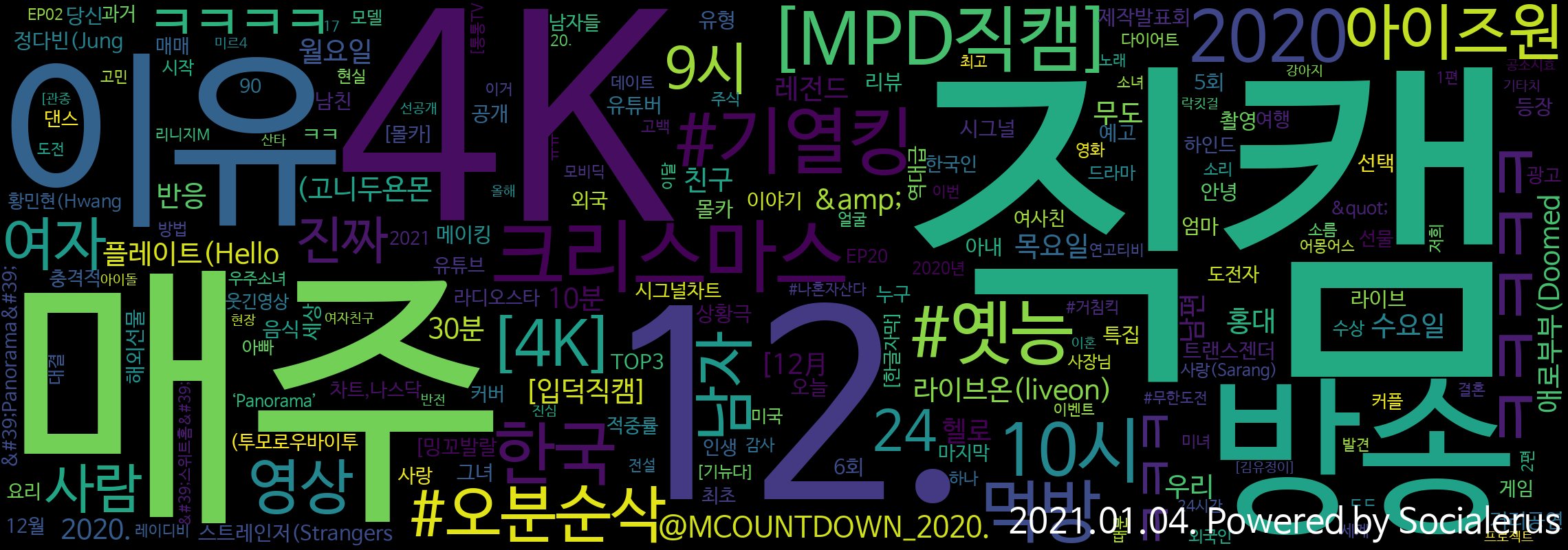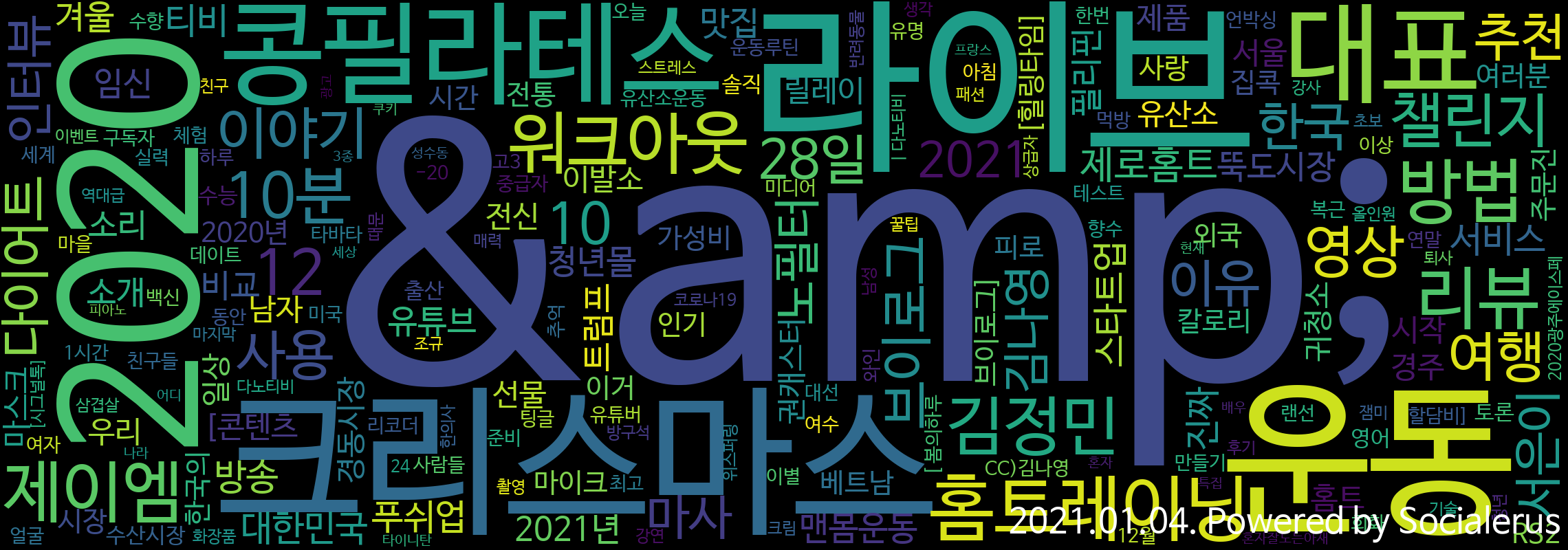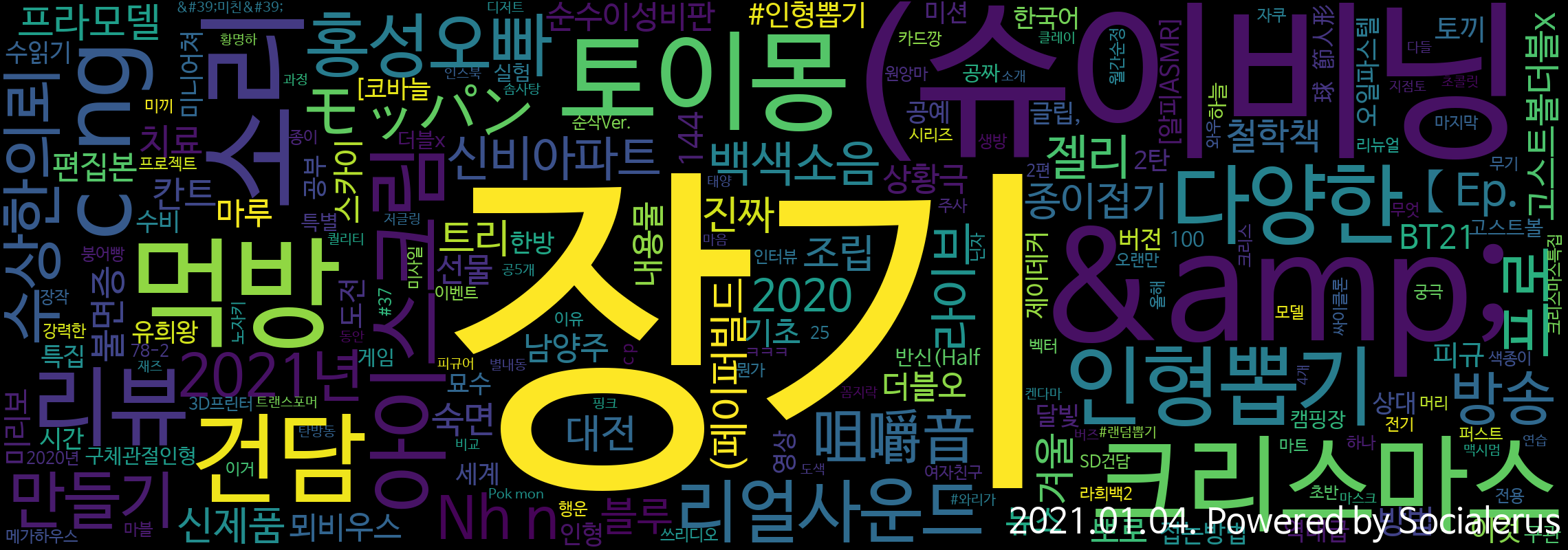 바로 최신 영상의 타이틀 단어를 분석해 최신 트렌드를 추출한 뒤, 워드 클라우드로 제공해 드리는 서비스입니다. 간략히 요약하면,