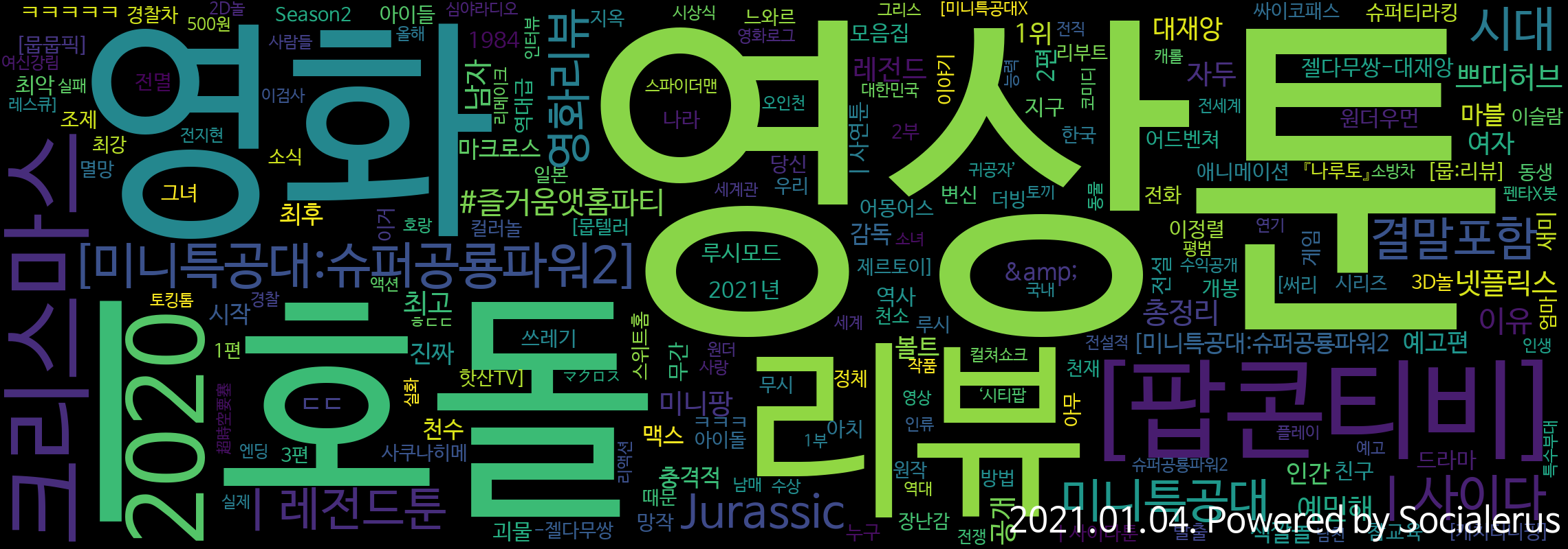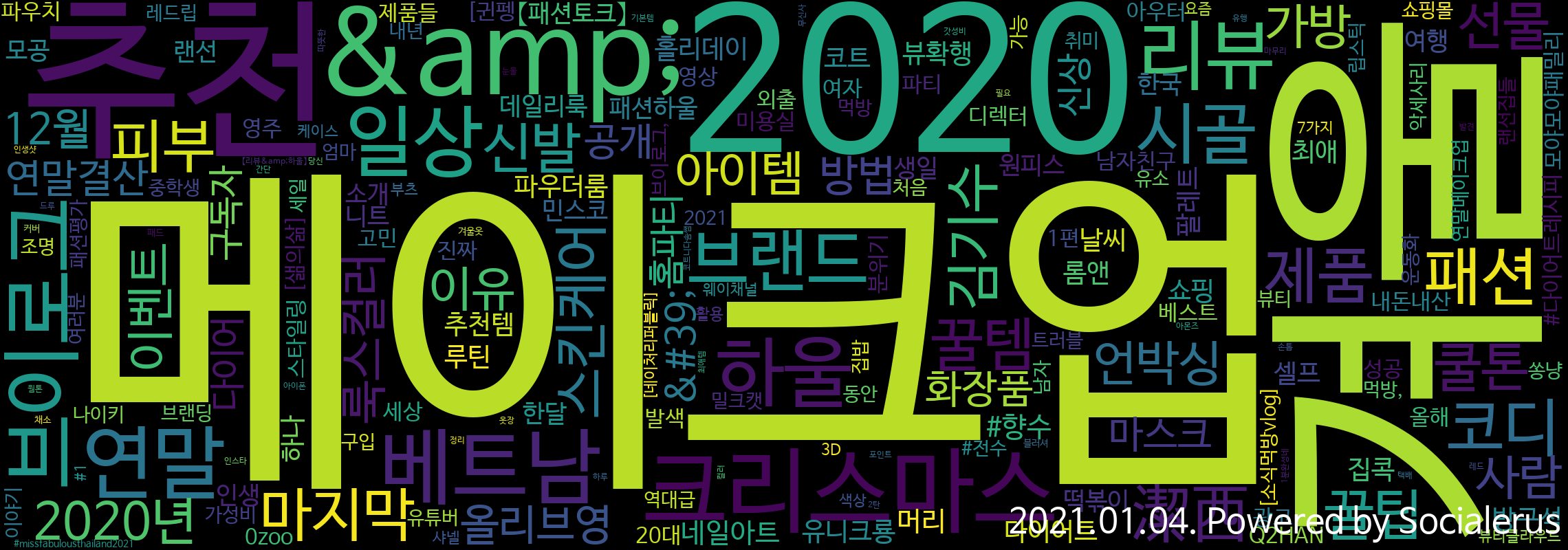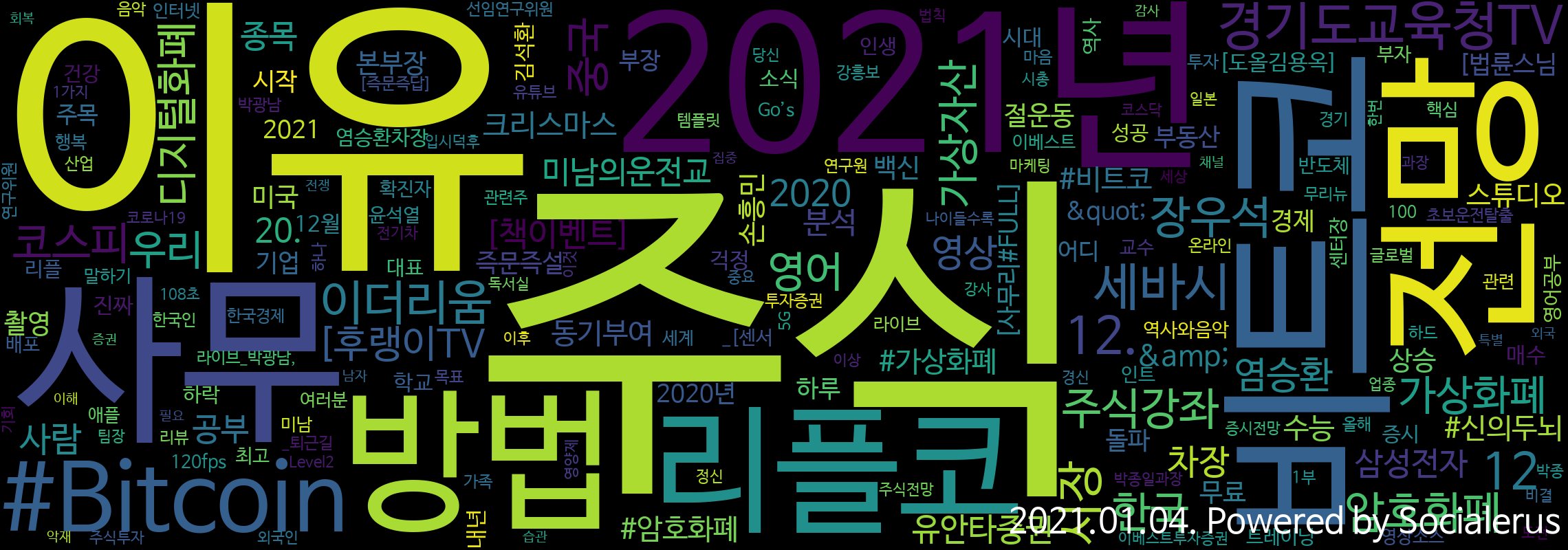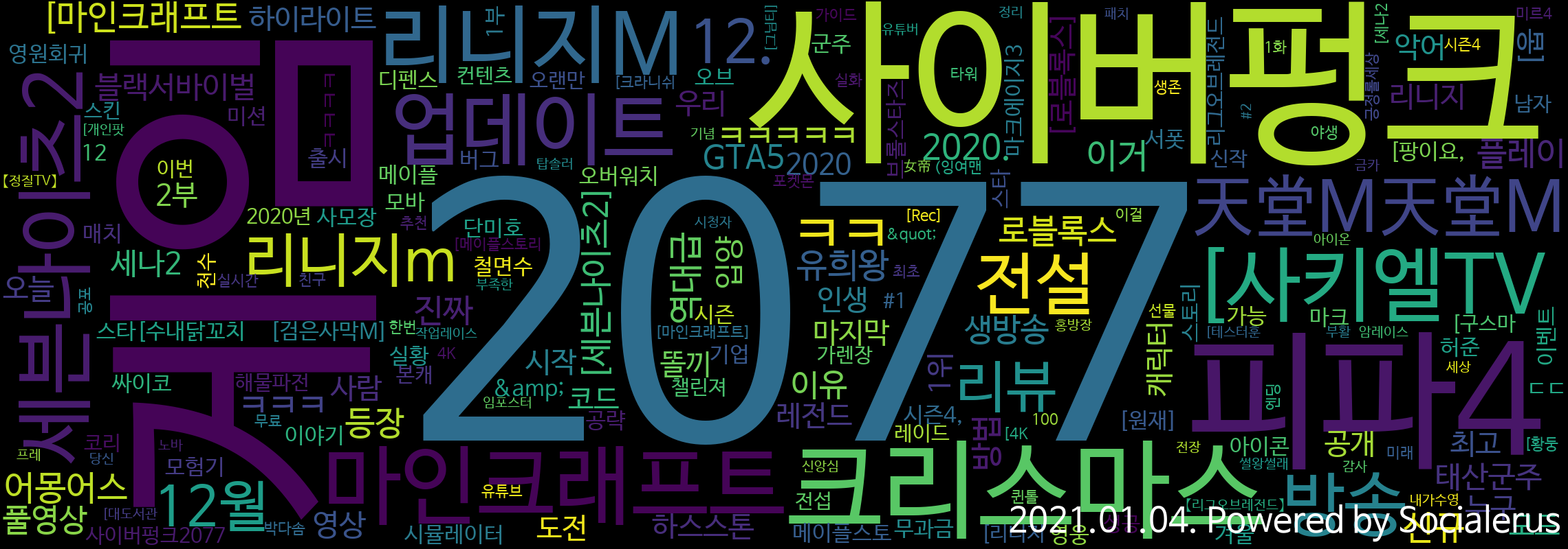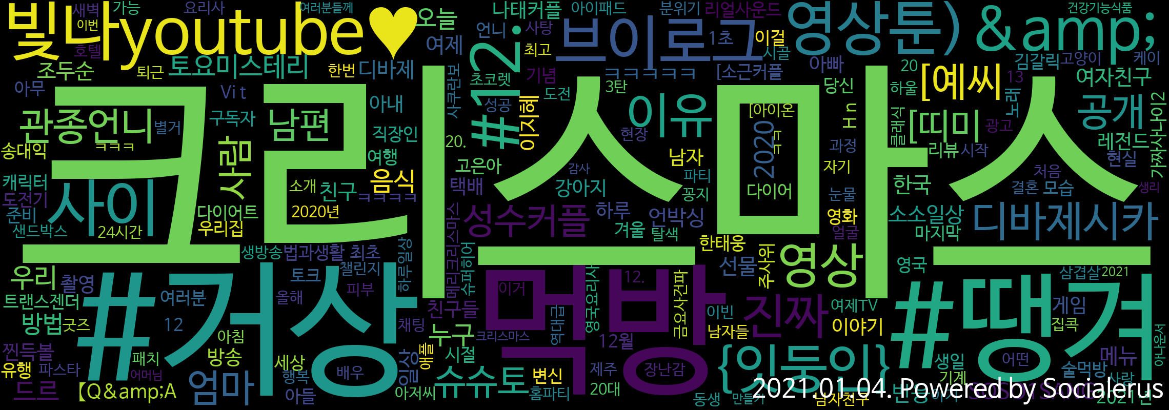 바로 최신 영상의 타이틀 단어를 분석해 최신 트렌드를 추출한 뒤, 워드 클라우드로 제공해 드리는 서비스입니다. 간략히 요약하면,