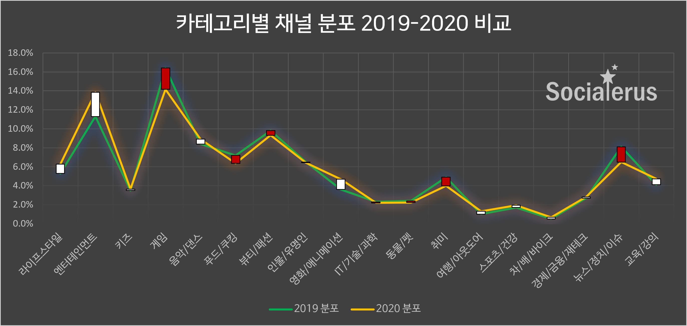 2020년 카테고리별 채널들의 분포는 2019년과 전체적으로 비슷했으며 “엔터테인먼트, 영화, 교육/강의 분야의 채널 수는 상대적으로 증가했고, 게임, 푸드/쿠킹, 뷰티, 취미, 뉴스/정치 등의 채널들은 상대적으로 감소” 한 것으로 나타났습니다. 특히 게임, 뉴스/정치 분야 채널들의 분포가 크게 감소한 이유는 신규 채널 유입이 타 분야에 비해 적었던 것으로 분석됩니다.