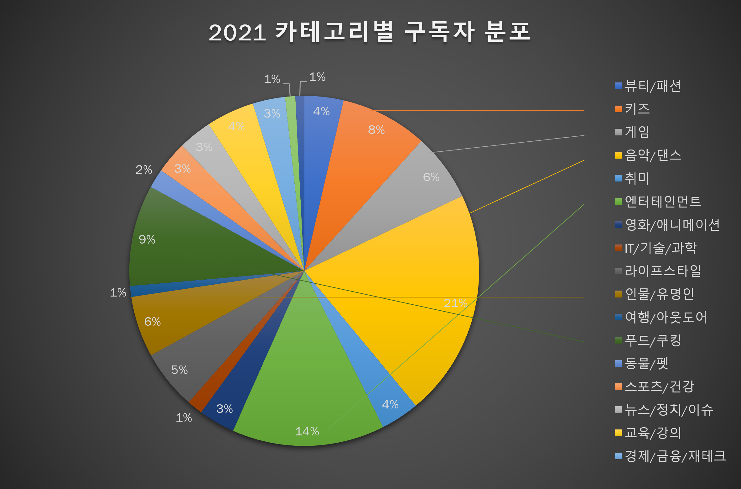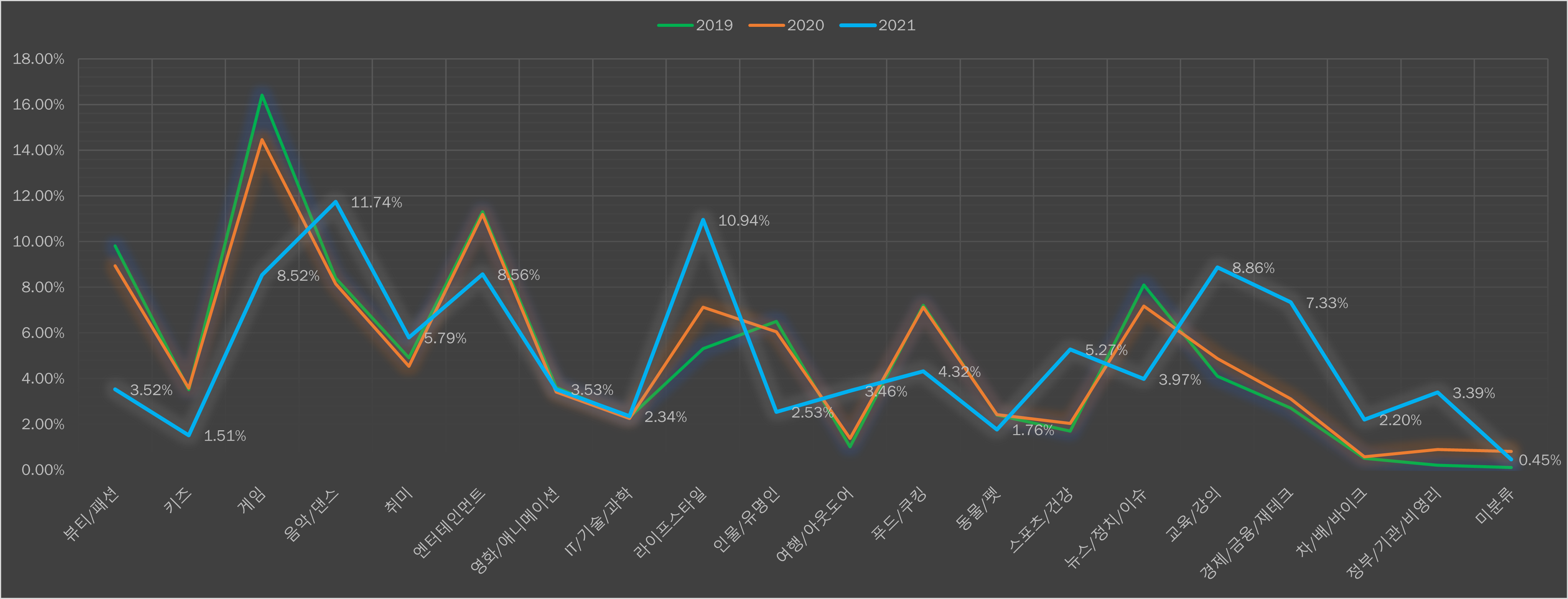 2021년은, “라이프스타일, 여행/아웃도어, 스포츠/건강 채널들의 약진이 돋보였으며, 특히 교육/강의, 경제/금융/재테크 채널들이 큰 폭으로 증가” 하였습니다. 2021년은 한국 유튜브가 특정 카테고리 위주에서 좀 더 다양한 주제로 외연을 넓힌 한 해 였습니다.
