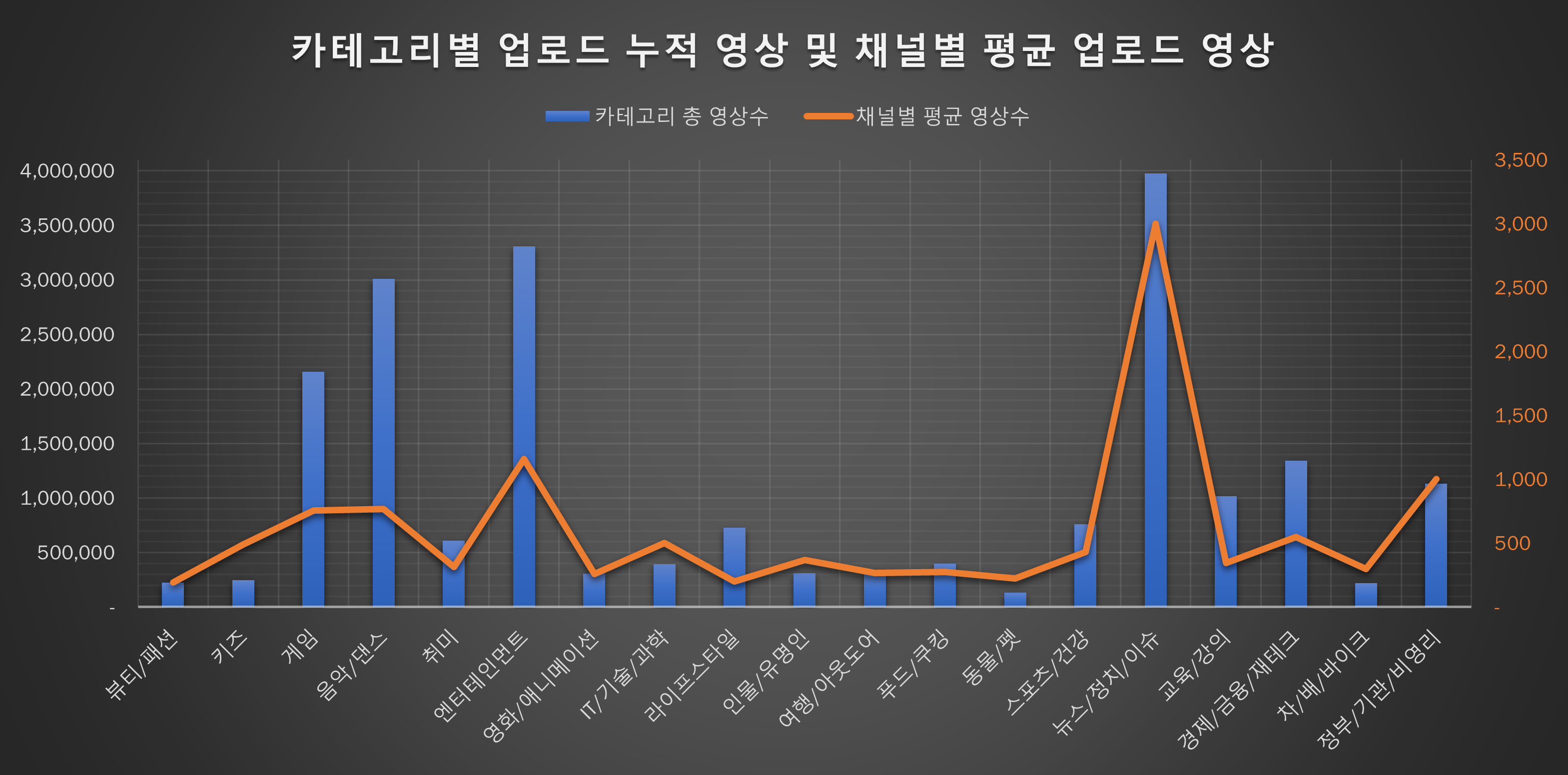 한국 유튜브 채널들이 업로드 한 누적 영상수는“총 2000만 개” 를 넘어섰습니다. 카테고리별로 살펴보면, 역시 뉴스/정치 카테고리의 영상이 400만개 넘어 가장 많은 영상을 업로드했으며, 엔터테인먼트와 음악/댄스, 게임이 그 뒤를 따르고 있습니다. 채널의 특성에 따라 다수의 영상을 업로드 하는 채널과 소수의 영상을 업로드하는 채널이 더욱 확연히 구분되고 있습니다.