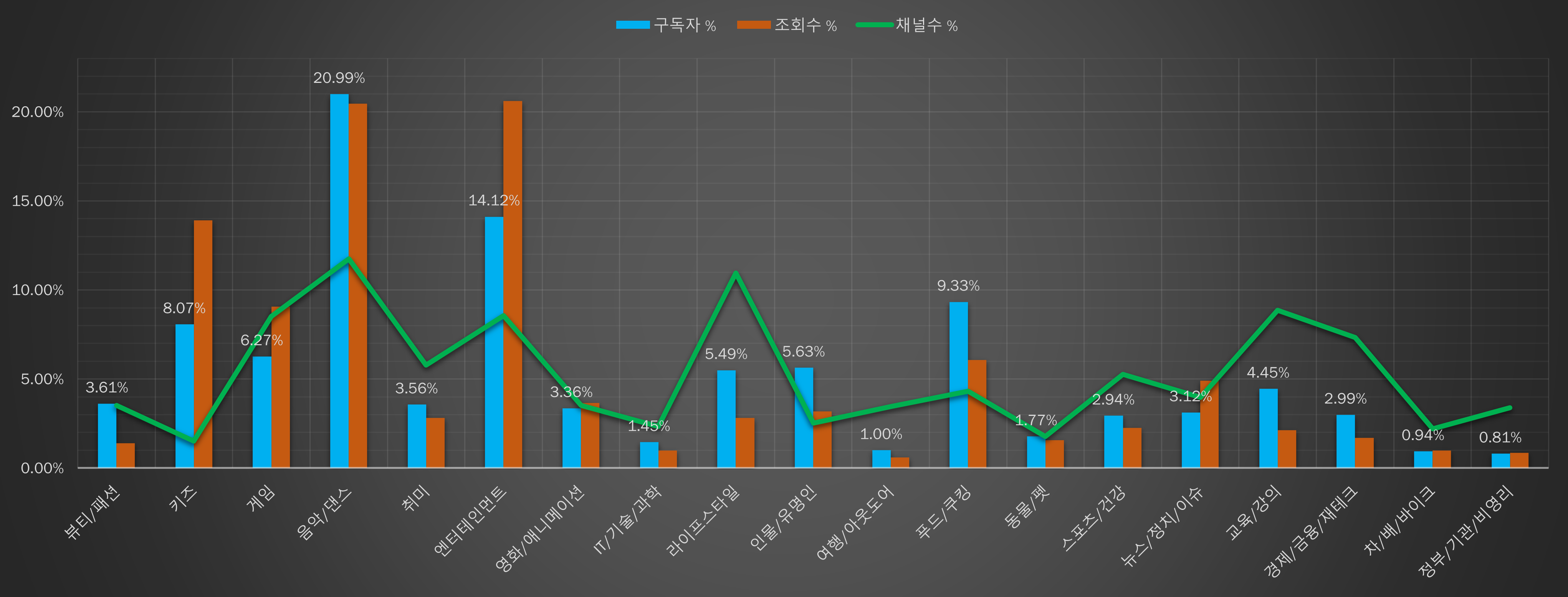 카테고리별 채널수(분포)와 총구독자, 누적조회수의 비율을 분석해 보면, “음악/댄스는 채널이 많은 만큼 구독자, 조회수도 높은 반면, 라이프스타일, 교육, 경제 채널의 경우 채널 수에 비해 구독자, 조회수는 아직 낮은”편입니다. 전체 구독자의 20%를 차지하는 음악/댄스 카테고리는 블랙핑크, 방탄소년단, SM, JYP 등 K-Pop의 영향이 구독자와 조회수를 견인하고 있습니다.