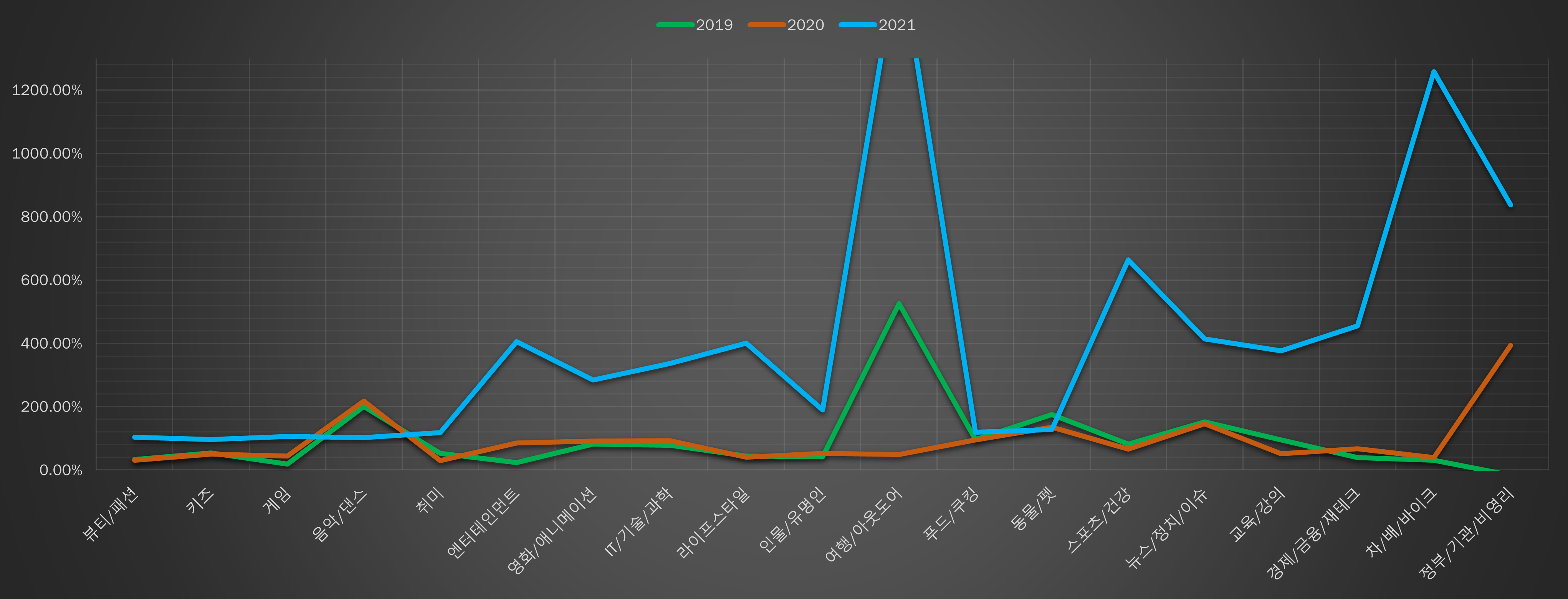 카테고리별 2021년도 구독자 성장률을 살펴보면, 2020년에 비해 전반적으로 크게 성장한 것을 확인 할 수 있습니다. “라이프스타일, 여행/아웃도어, 스포츠/건강, 경제/금융/재테크, 차/배/바이크 등의 카테고리 구독자가 크게 성장” 하였습니다. 특히 여행/아웃도어의 경우 2019년 높은 성장률에 비해 2020년은 코로나로 침체기를 맞았으나, 2021년 다시 폭발적인 증가를 보여주고 있습니다.