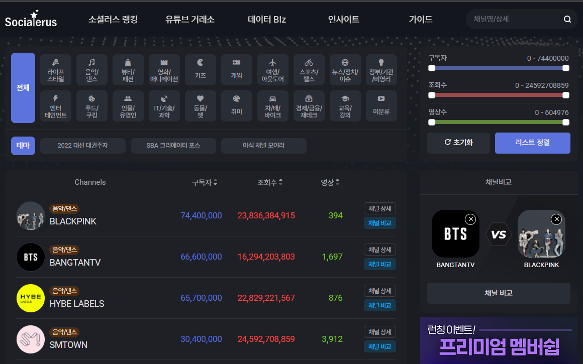 소셜러스 유튜브 빅데이터 랭킹 및 채널 분석 - 인사이트, 구독자, 조회수성장률, 영상, 트렌드분석, 크리에이터, 인플루언서, MCN, 채널 거래소, 채널 매매/구매/판매, 광고주,유튜버,플랫폼 Sociale