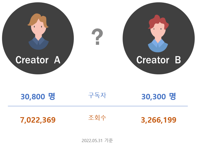 자, 2022년 5월 31일 기준, 실제 두 유튜버의 데이터를 같이 보시죠. 구독자는 3만 300명과 3만 800명으로 500명 밖에 차이가 나지 않습니다. 그런데 조회수는 7백만과 3.2백만으로 두 배 이상 차이가 납니다. 조회수의 차이는 유튜브 광고 수익에 차이가 있다는 것을 의미하고, 외부의 PPL이나 협찬의 기회도 다를 것입니다. 이렇게 구독자와 조회수만으로도 생각해 볼만한 여지가 많은데, 여기에 "영상당 조회수는?" "조회수당 좋아요 비율은?" "같은 조회수라도 달성하는데 걸린 기간이 다르다면?" 등의 질문들을 더하면 채널의 가치를 평가한다는 것은 생각보다 복잡해집니다.