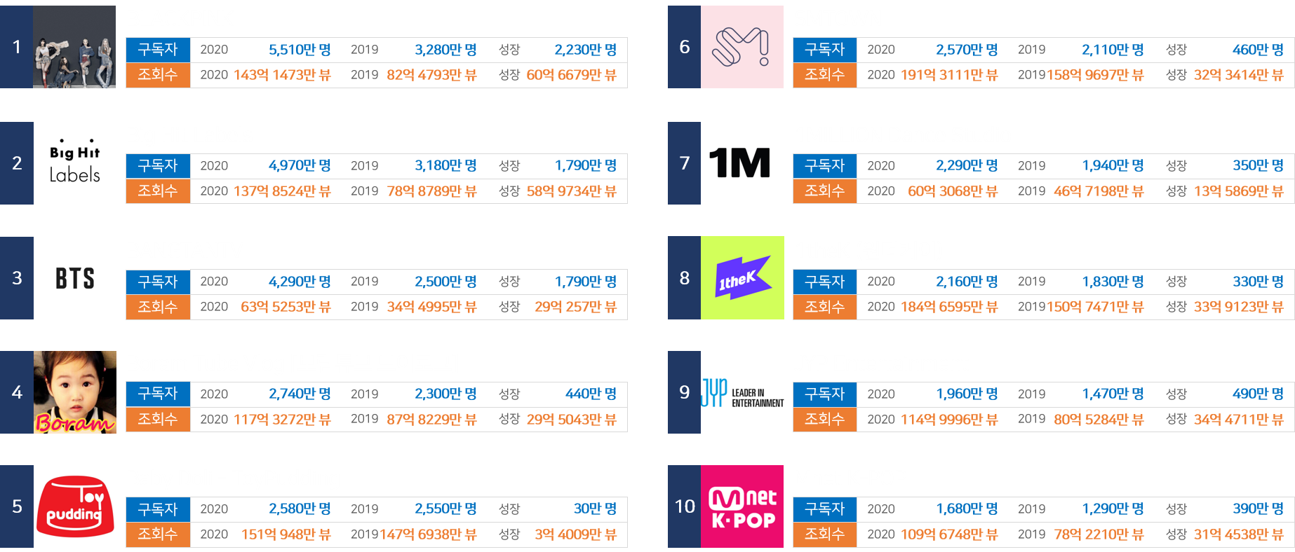 블랙핑크는 1년간 구독자 2,230만명 증가, 조회수 60억 6679만이 증가하며 명실상부 대한민국 최고의 채널로 자리 잡았습니다. 2~3위를 차지한 Big Hit, BTS는 채널이 두 개로 나눠져서 2,3위를 차지했지만 합해 계산하면 1년간 구독자가 3,400만명 , 조회수는 110억이 넘어 압도적 1위 자리를 차지했을 것으로 보여집니다. Top 10 중에 보람, 토이푸딩 채널을 제외하면 8개가 K-pop 관련 채널임을 볼 때 한류의 전세계적인 인기를 가늠할 수 있습니다.