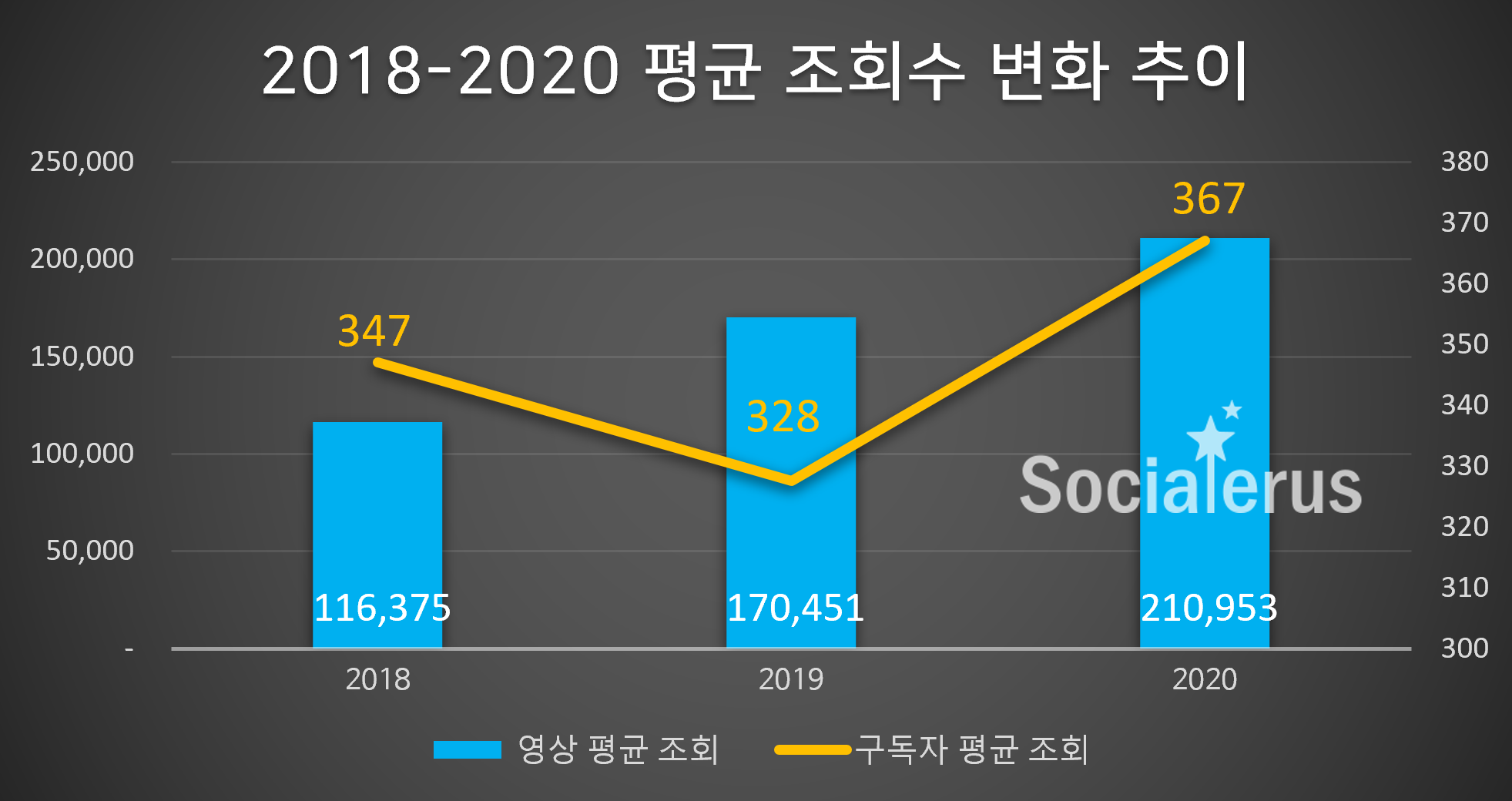 조회수 성장률이 높은 것은 평균 조회수 변화에서도 확인 할 수 있습니다. 영상 한 편당 평균 조회수와 구독자 한명당 평균 조회수를 분석해 보면, “영상 한 편당 평균 조회수는 2018년 11만 6천에서 2020년 21만으로 두 배 성장했고, 2018년은 구독자 한 명이 평균 347편의 영상을 시청한데 비해, 2020년은 367편의 영상을 시청” 하였습니다.