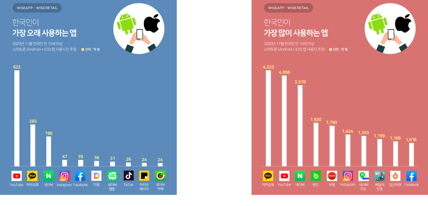 와이즈앱이 발표한 자료에 따르면 “유튜브 앱 사용 시간은 2위 카카오톡, 3위 네이버를 합한 것보다 월등히 높게 나타나며 가장 많이 사용하는 앱 순위에도 1위 카카오와 근소한 차이를 보이며 2위를 차지했습니다.” 코로나로 실내 생활이 많아진 2020년은 유튜브가 폭발적으로 성장할 수 있는 기폭제가 되었습니다.