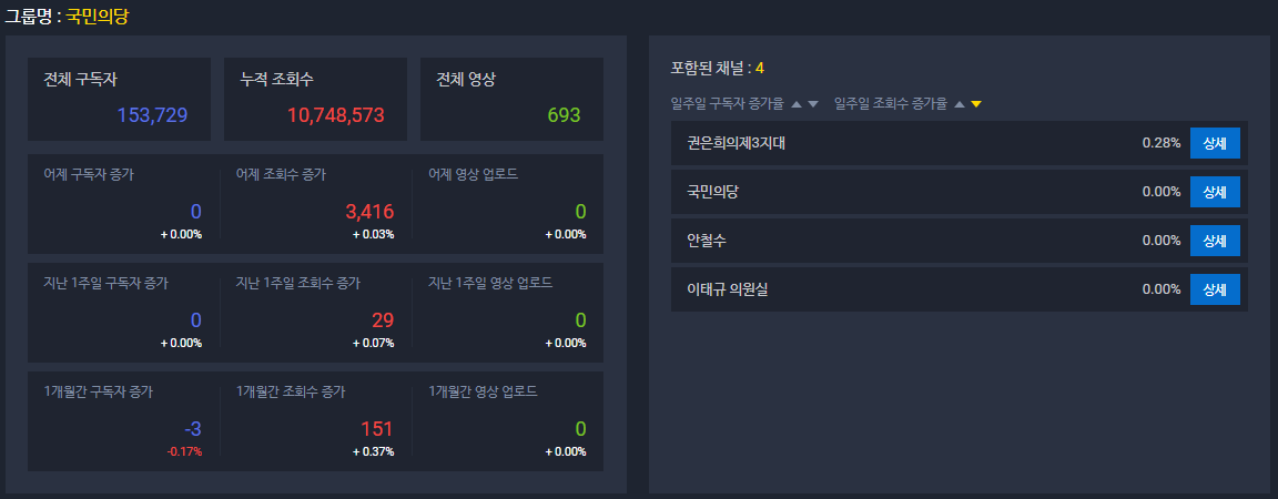 국민의 힘 전체 구독자는 548,821명이고, 누적 조회수는 42,976,143입니다. 포함된 채널들의 성장률도 매우 저조한 편으로 볼 수 있습니다. 영상 평균당 조회수는 6,472입니다.
